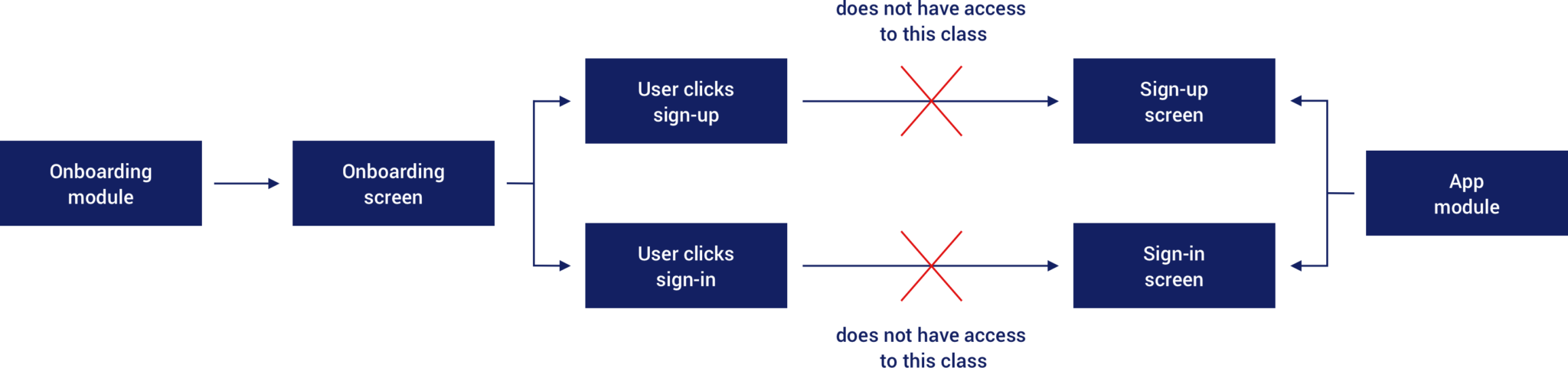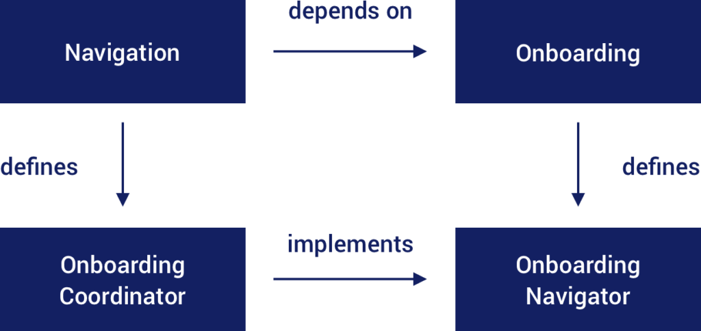 When it comes to this Onboarding module, as previously mentioned, it will define an interface (lets call it the OnboardingNavigator) that defines the the required navigation. This might look a little something like this: