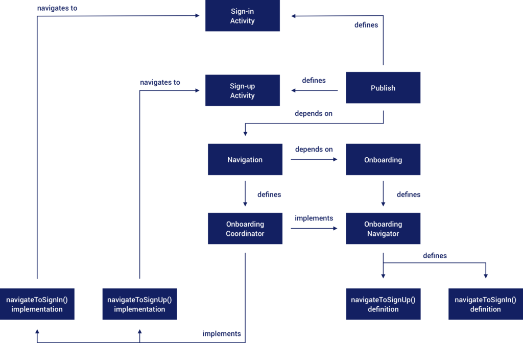 From here, the application module using that onboarding library can implement the interface and satisfy the navigational requirements. So for example, the activity launching the screens of the onboarding library may implement that interface and when the methods are triggered, handle the navigation around sign-up and sign-in.