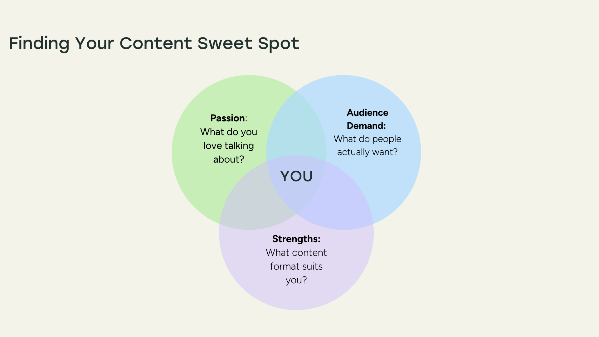 Beyond showing up, growth came from experimenting. I tested everything I was writing about at Buffer on my own account: finding a niche, choosing content pillars, and then narrowing into that “Venn diagram middle” where what I enjoyed overlapped with what my audience needed. That overlap became my content sweet spot.