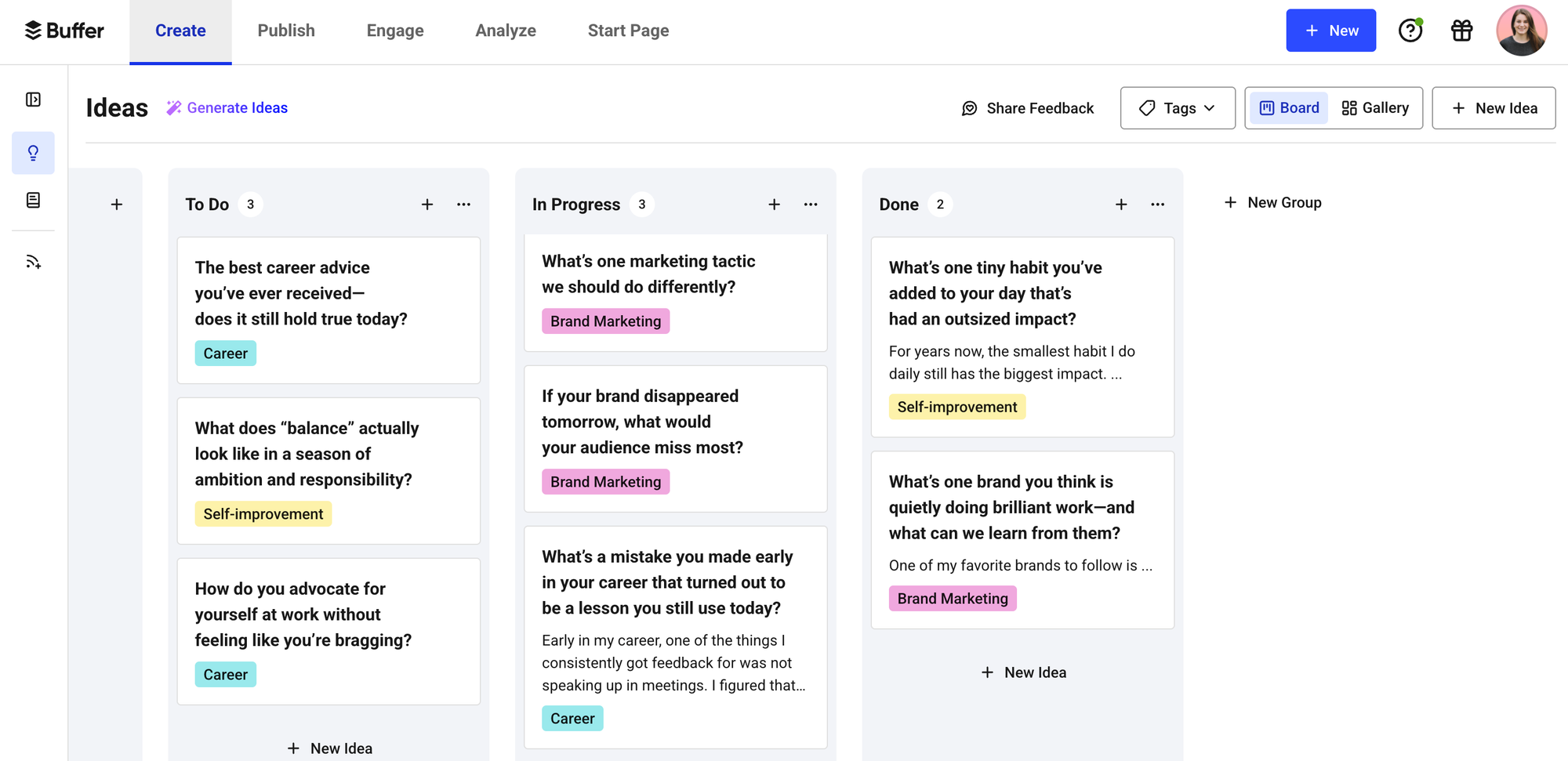 I use Buffer’s Create Space to store all my post ideas. I also tag each one by content pillar, which makes it easy to keep things balanced and avoid posting the same type of content over and over.