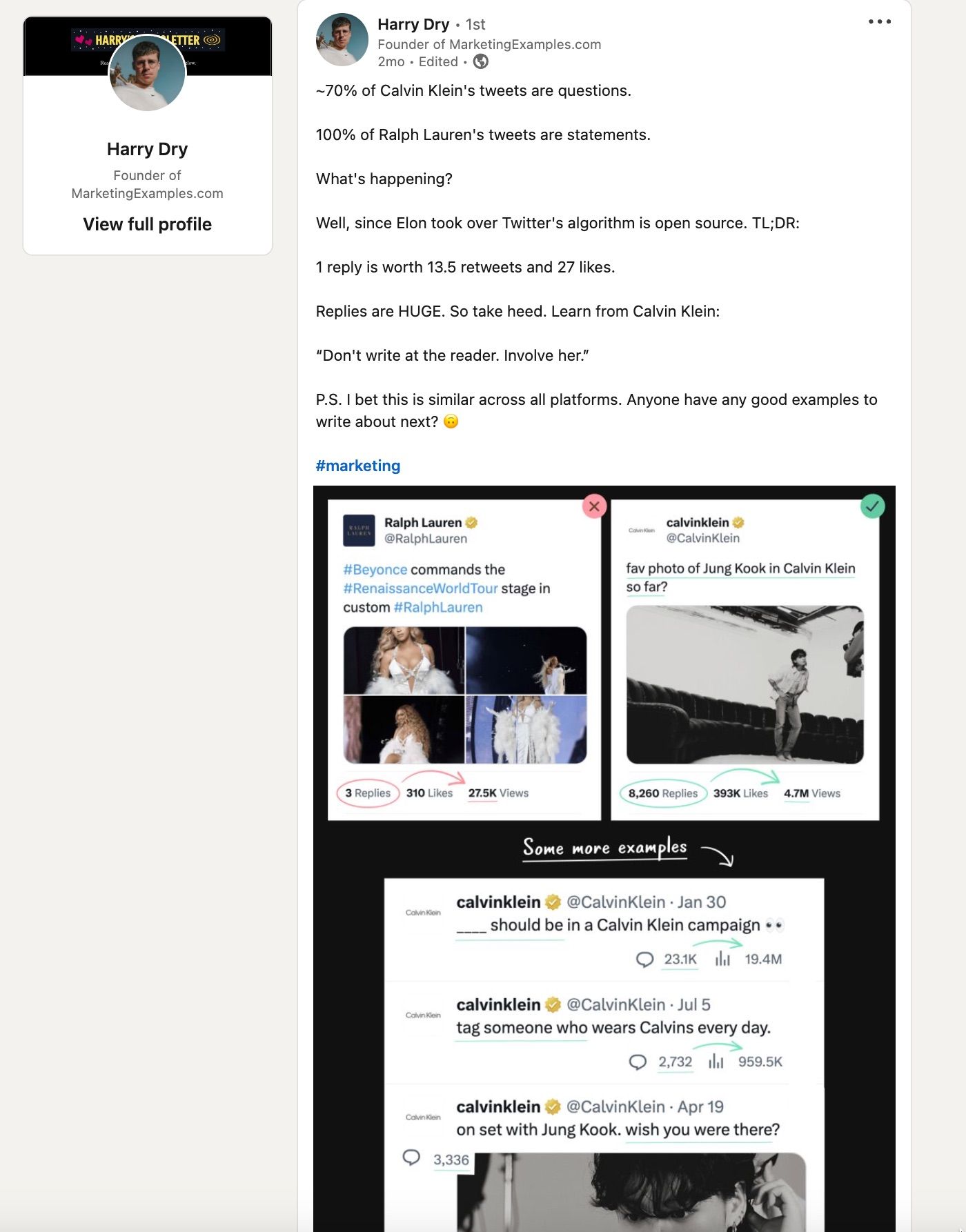 For example, after reading this post by Harry Dry, the visuals act as proof of the insight shared: