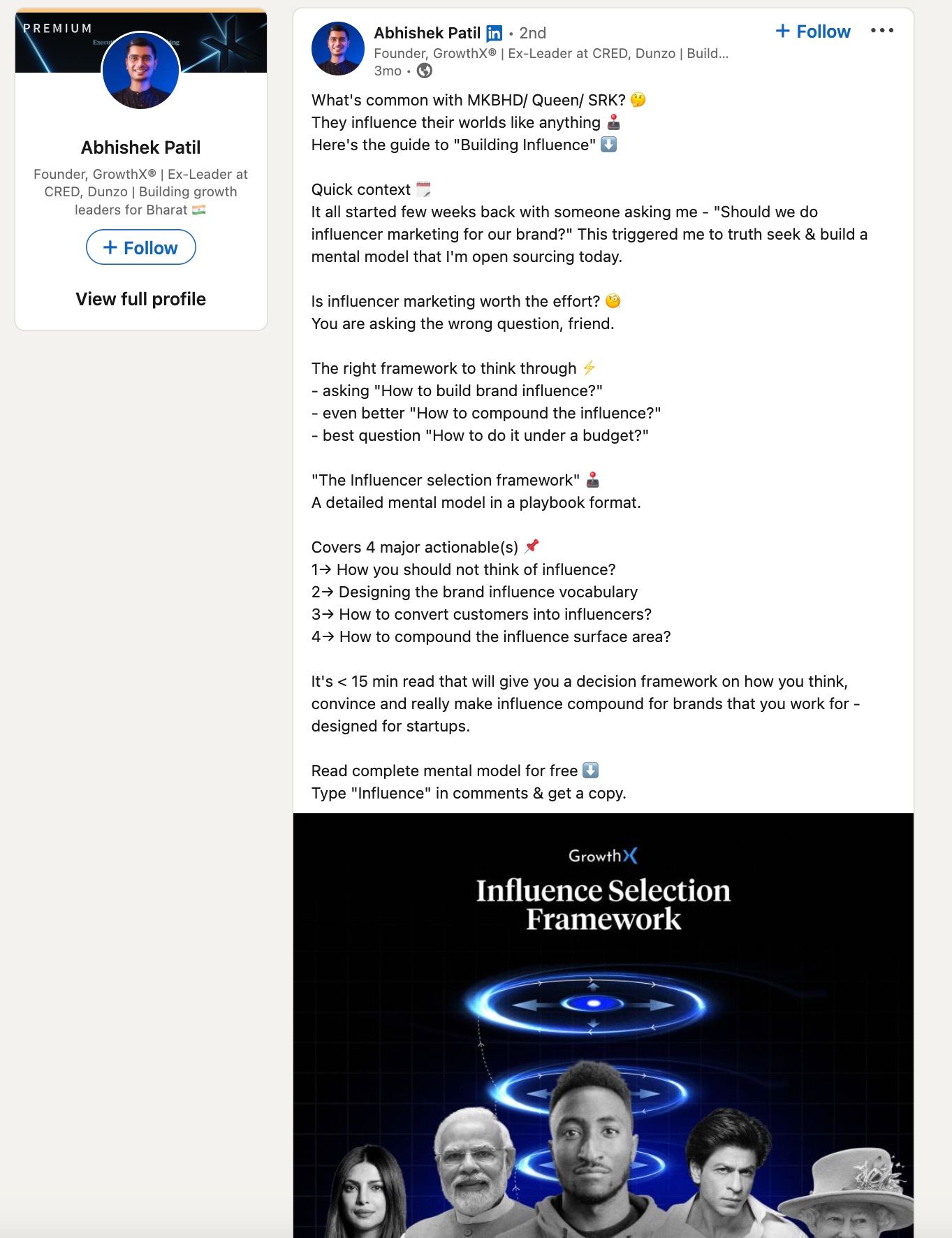 Abhishek Patil is the founder of GrowthX, which runs cohort-based courses to accelerate growth careers. Here, he shares a free guide on the framework for influencer marketing with a good supporting text that generates curiosity, trust, and engagement.