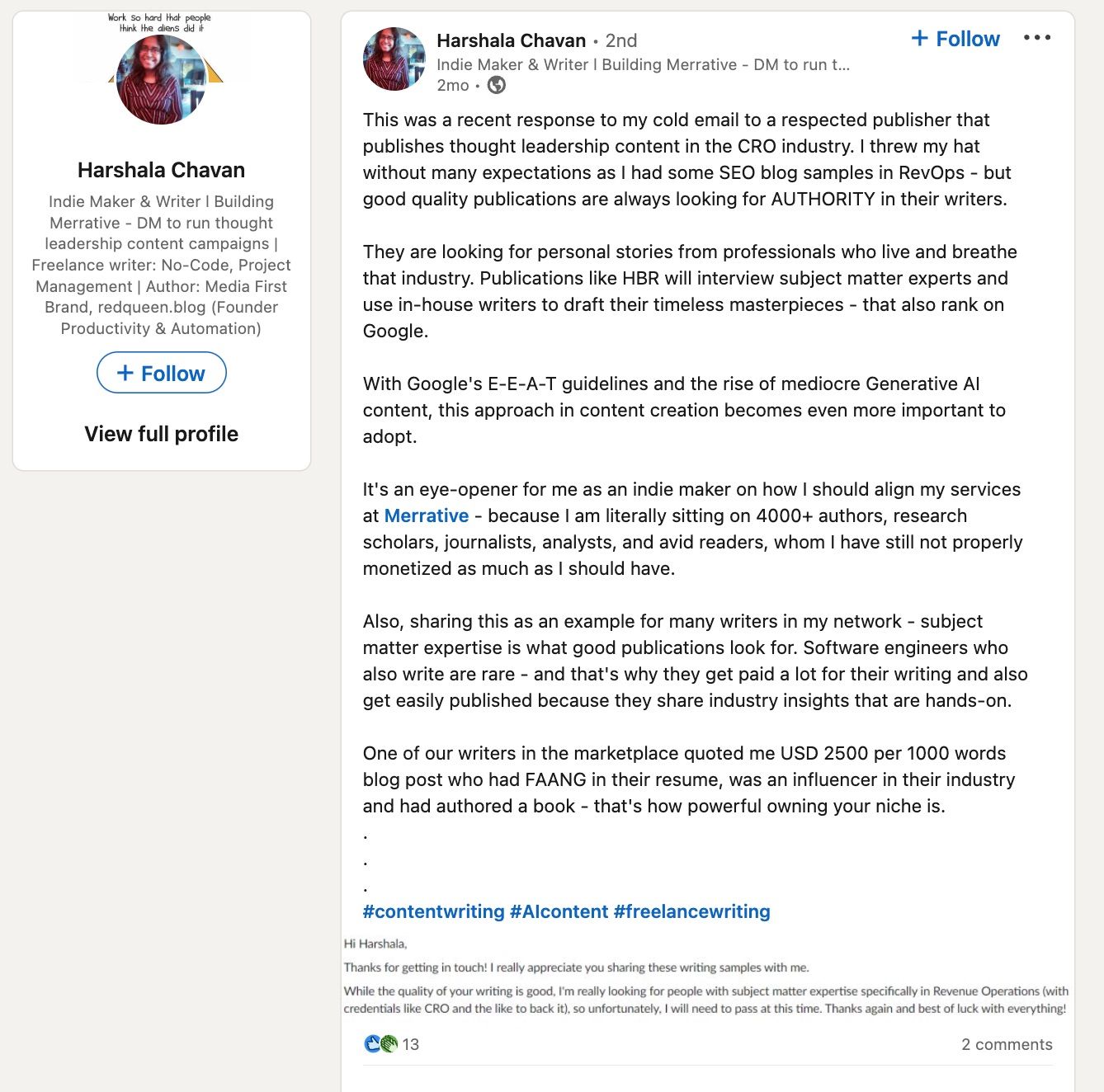 Here, I shared a basic screenshot of a Slack message that supports my personal experience of getting hired as a writer in the age of Generative AI writing. I did not use anything fancy, yet I got three DMs asking about my services: