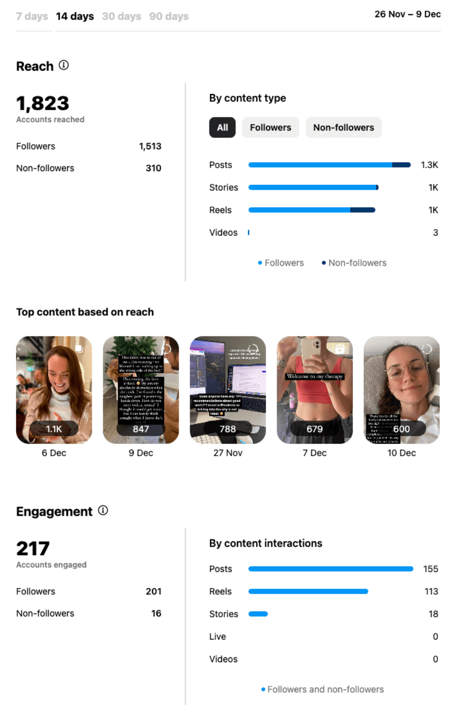Down to the juicy stuff: did Meta Verified actually make a difference in my content performance? Let’s look at my stats in the period before I subscribed.