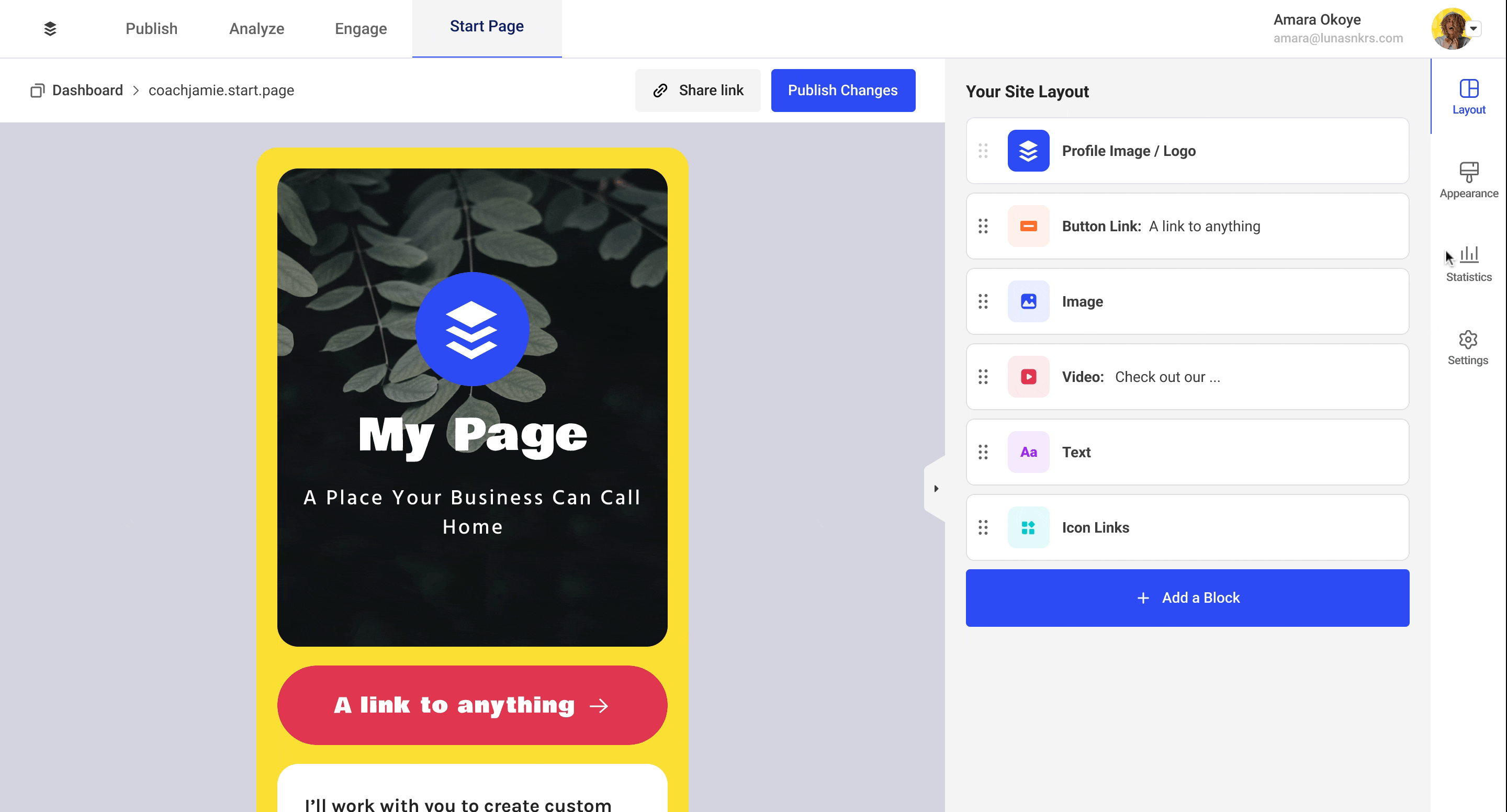 Fast-forward seven months, and there are now thousands of different combinations to customize your page to express yourself and your brand. Load up Start Page today, and it greets you with templates to help you get set up. Each template differs based on what you're trying to accomplish. Plus, templates come packed with blocks, designs, and features to help your page shine. You'll see statistics and new blocks for YouTube videos and Spotify tracks. Soon, you'll even be able to create multiple Start Pages.