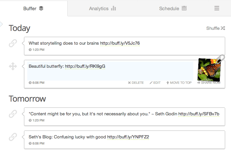 With this recent iteration, the Buffer web version is more tailored to manage and learn about your social sharing. It’s become more of a place to check on how well your posts are performing and to move and edit updates in your queue more easily. As more and more awesome developers have built on top of the Buffer API, adding to your Buffer from anywhere has already become a ton easier.
