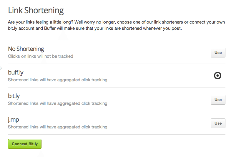 We’ve got several link shortening options for you available. Whichever one is best, simply choose it and of course you can also have different shorteners for different accounts: