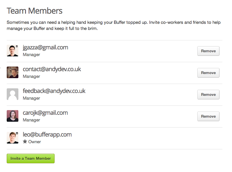 Want to collaborate with co-workers and friends on filling up your Buffer? Invite them over in the team members tab: