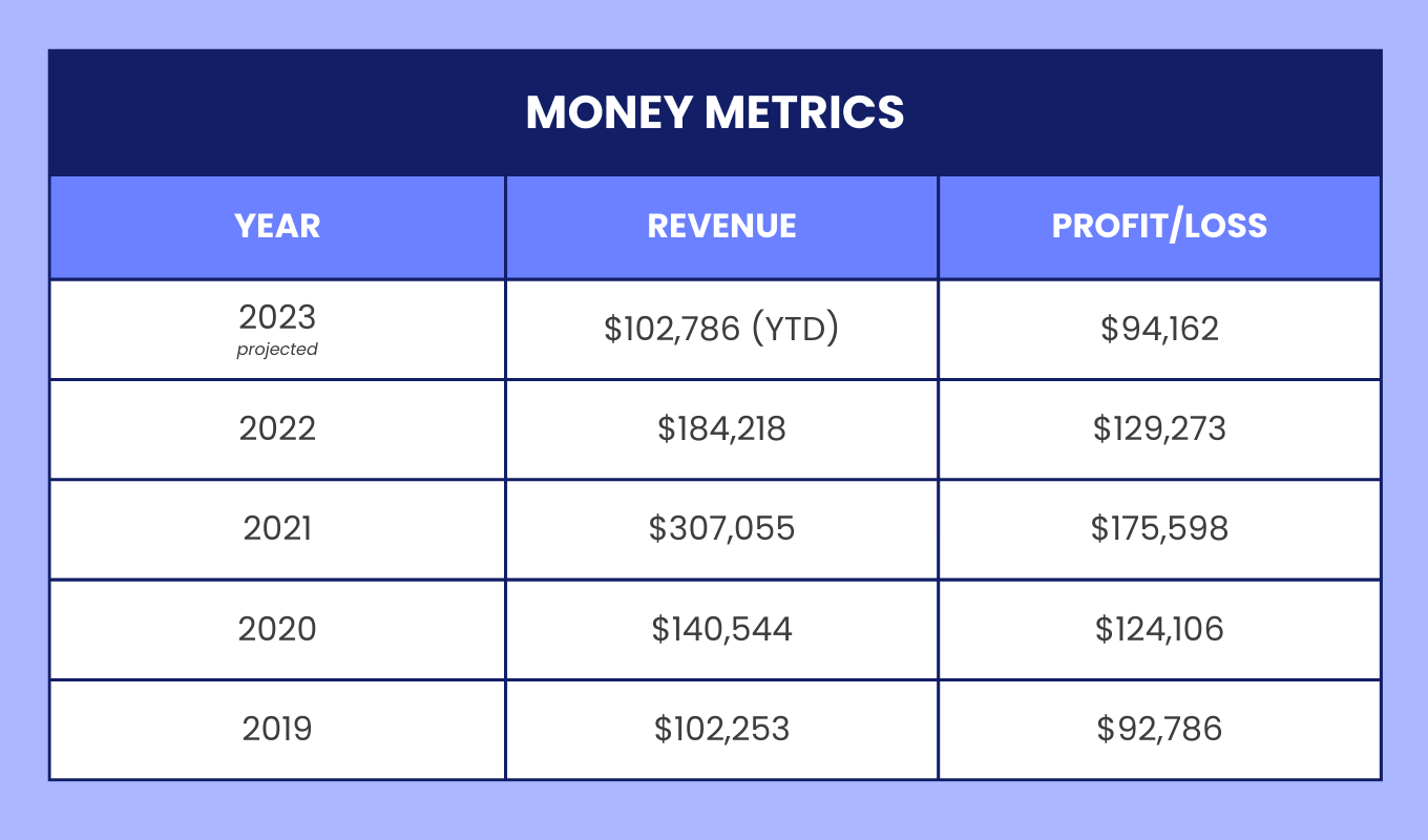 Her growth path, however, has been pretty uncommon. For one, she has built a stable and viable business, achieving six figures in revenue every year for the past five years and even bringing in multiple-six-figures in 2021 when she expanded her business with subcontractors. But, she’s also made the intentional decision to scale back over the past couple of years, stopping her work with subcontractors, cutting down client projects to what she could manage on her own, and reducing her revenue by over $100,000.