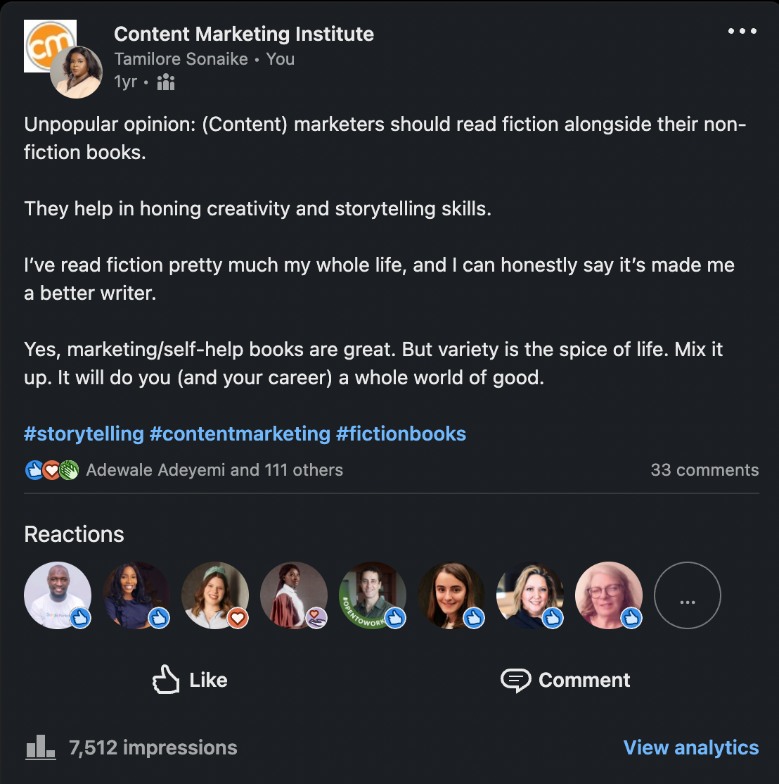 Another thing I used to do to circumvent this fear was to rely on my industry friends. I would share my content with them so they could let me know if it was good enough to post. This went a long way in bolstering my confidence.