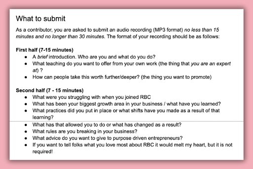 I offer this opportunity to my group coaching program and have them apply with a short description of what they’d want to cover in the episode. If they’re accepted, I send along a structure to follow when recording and additional tips for making their episode as strong as possible. The first half of the episode, I encourage them to promote their own work and expertise, and then in the second half I have them talk about the work they’ve done with me and their biggest learnings from the process.