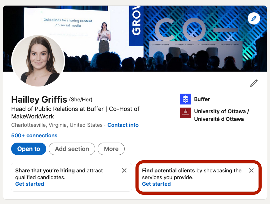 Or, if your company is a service provider, use this feature to find your next client! At the top of your profile page, click the “Find potential clients” box to add information about the services you offer and show up in the marketplace.