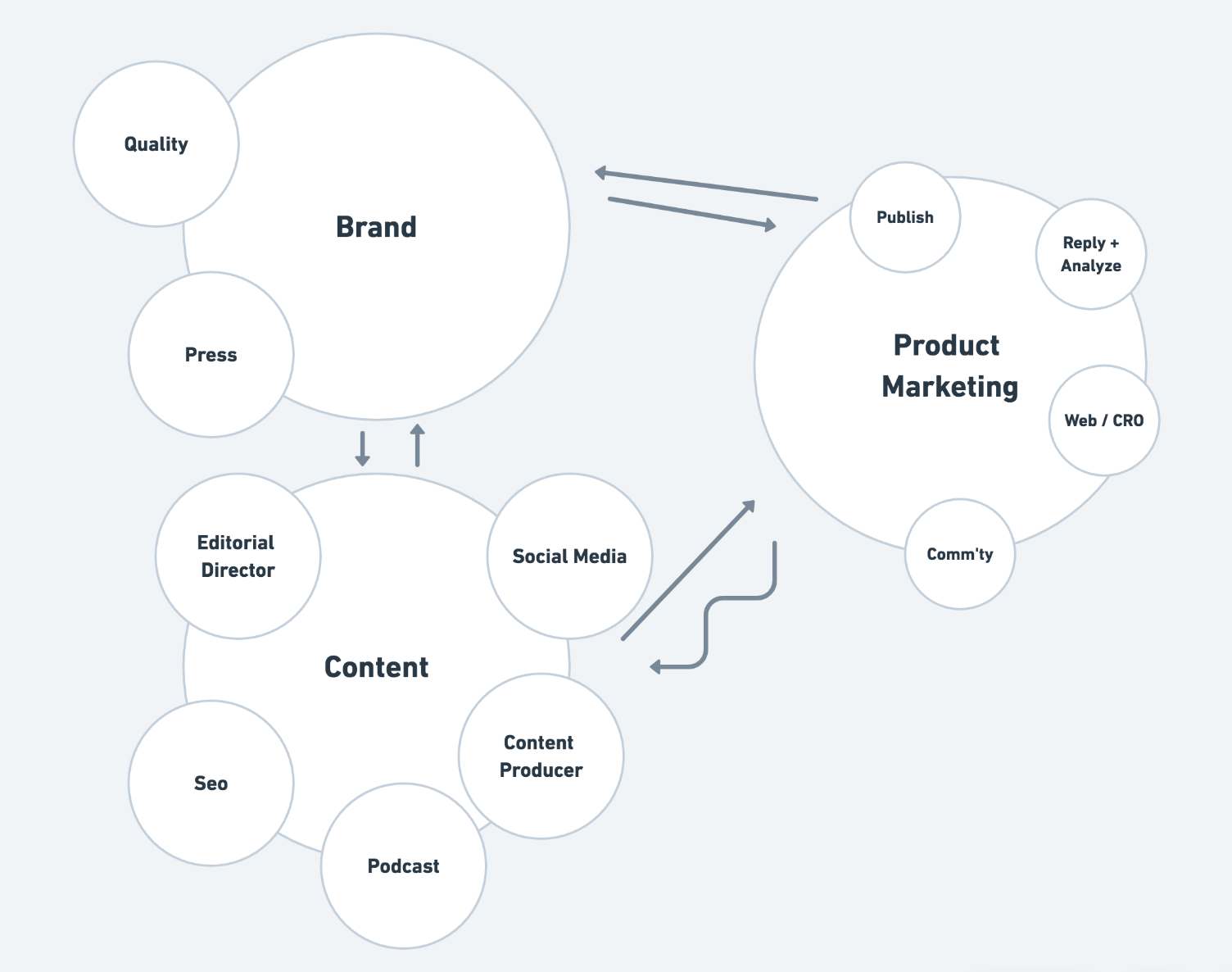 This diagram shows an example of how the role of a product marketer not only touches customers and your audience but also needs to serve the company itself. Our product marketers can influence company strategy with roadmap discussions and create momentum by sharing about product progress with the team.