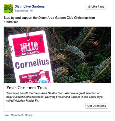 One great example of content focused on this theme comes from Distinctive Gardens an Illinois-based plant and landscaping business. The company ran a three-day campaign on Facebook to attract people to its annual Christmas tree fundraising event. Over the three day period, it increased total sales for the fundraiser by 2.8X (on the previous year).