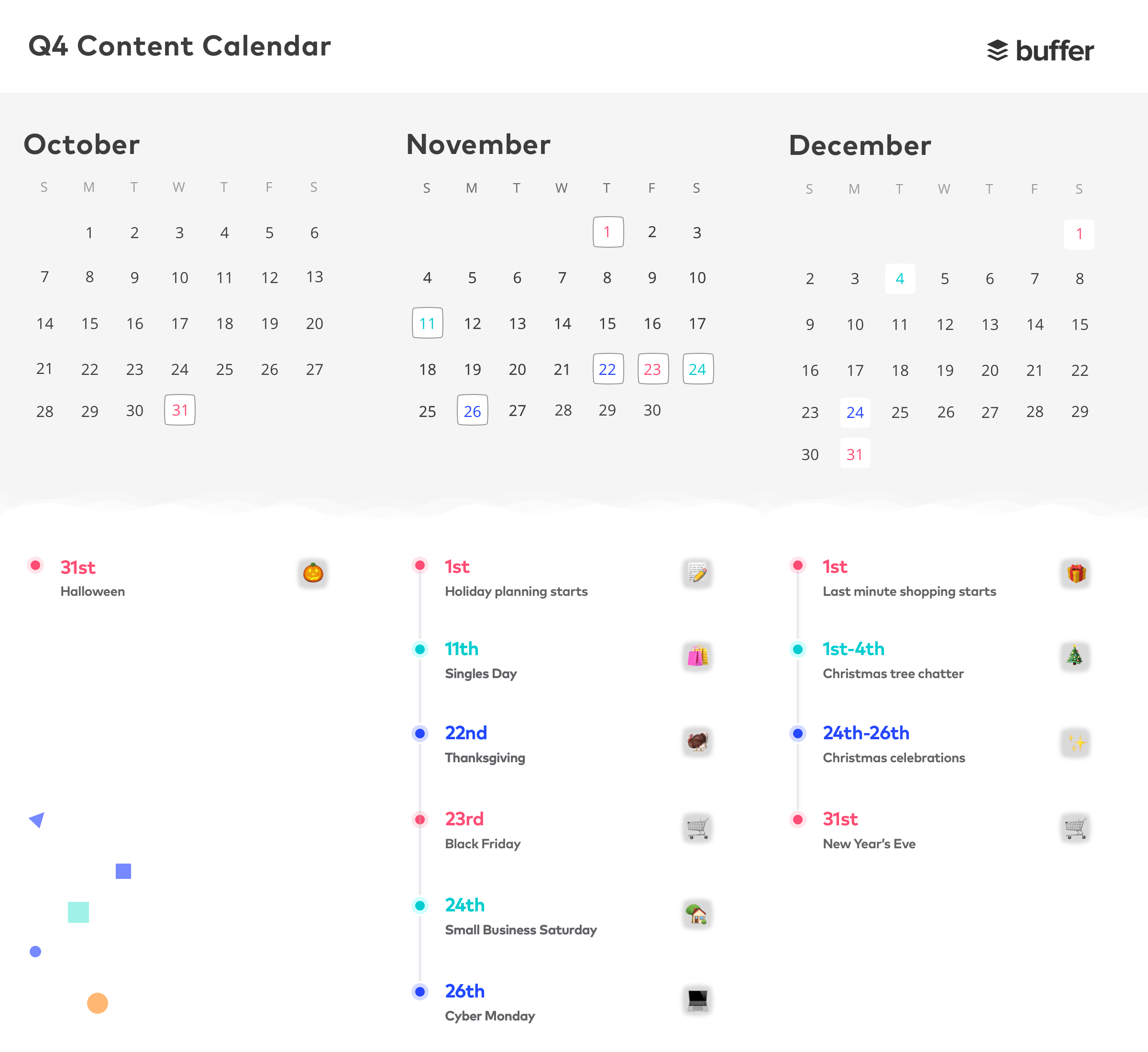 To help, we’ve put together this Q4 content calendar to break down some of the key dates and events from October 1st to December 31st, giving you important data and a few marketing ideas for each.