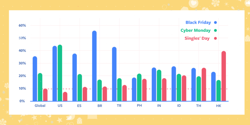 The below chart shows the percentage of people who report shopping on key shopping holidays — in the U.S. 7% of people surveyed by Facebook reported shopping on Single’s Day: