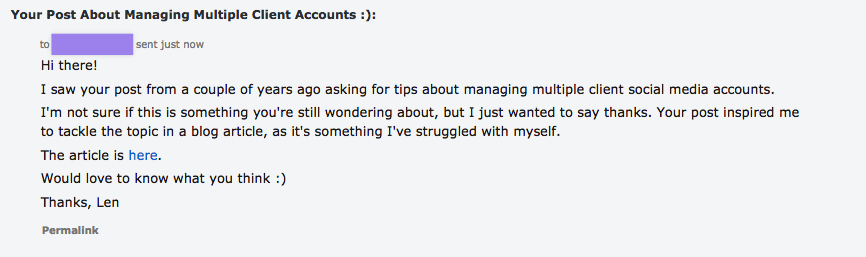 “I started my first ever job in Social Media last month for an agency. What tools/tips do you have for running multiple client accounts?”