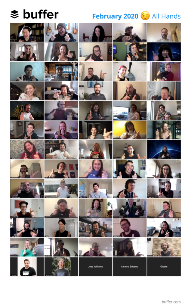First off, we gather in a virtual place instead of a physical one, using a tool called Zoom that lets every team member join in via video. It’s always neat to see people’s faces (and not just their profile pictures), plus Buffer babies, puppies, and other pets and family members often make it onto the screen as well.