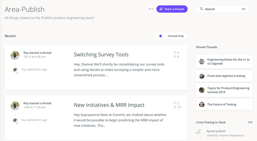 Threads has been the perfect spot to talk in-depth across many time zones, easily make decisions, and have a place where longer-form communication could live.
