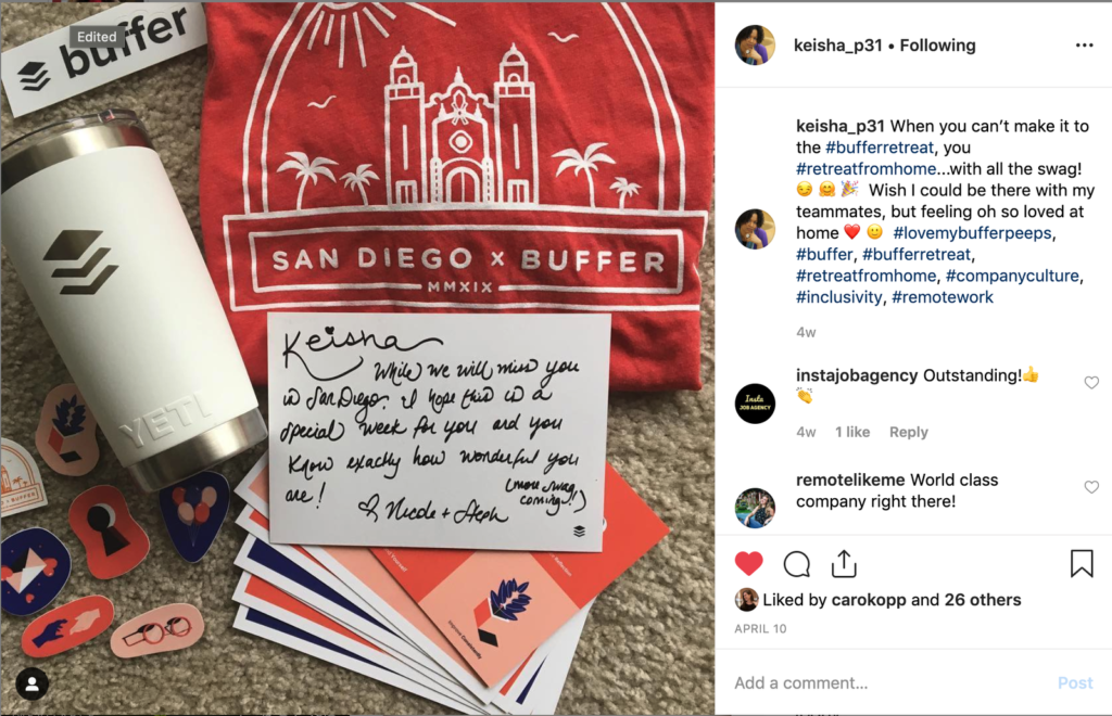 “I also received constant messages from the team asking how I was doing and to remember to take care of myself,” she continued. “That’s the type of details that makes Buffer such a valuable place to work. Although I wasn’t there, I felt like a valuable member of the team.”
