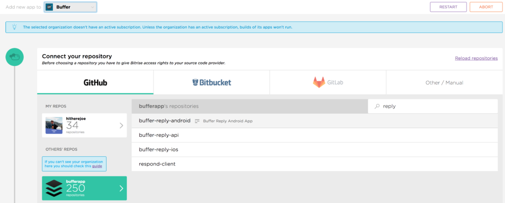 When you begin the flow for adding a project to Bitrise, the initial project wizard setup is super handy and does a lot of the hard work for you ? At first, you’ll be shown a screen that allows you to select the repository you wish to add, for us we’re going to add the Reply project from Github: