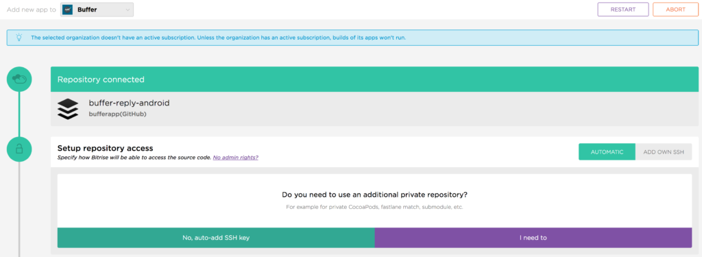 Great! Step one is done and we’ve added a repository to our Bitrise project, next we just need to setup the access requirements – we’re not using any external private repositories so we’re just going to select ‘auto-add SSH key’: