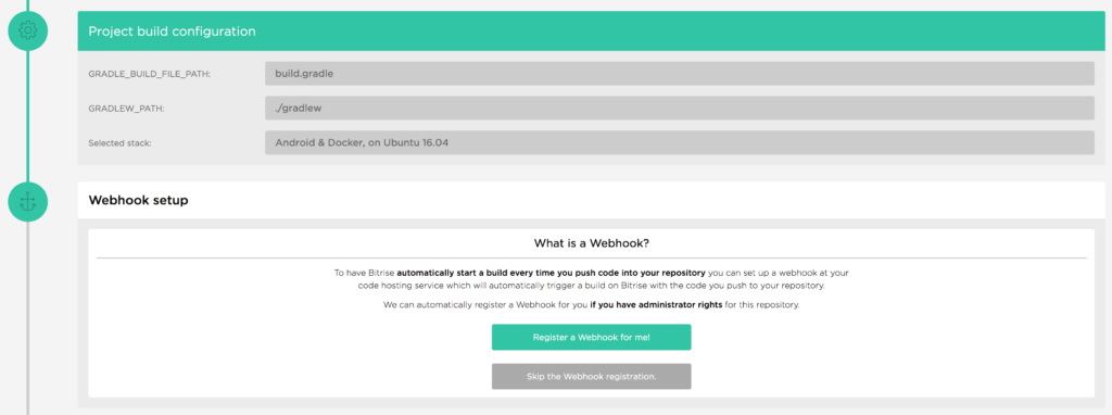 Once that has succeeded (you may need to give it a few minutes) you’ll be able to add some project build configuration details and set up a webhook, this allows you to trigger builds whenever commits are pushed to your repository or if a pull request is opened.