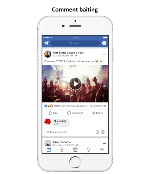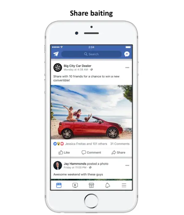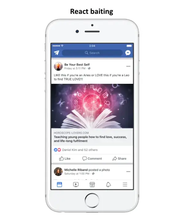 On this list, you’ll find things like ad farms, spam, comments that are likely to be reported or hidden, fact-checked misinformation, and more. Engagement baiting is a newer addition to these guidelines, which they explain here.