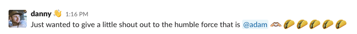 To send someone a taco all you have to do is @-mention their name in Slack and add in the :taco: emoji. Each person is allowed to give out five tacos per day. ?