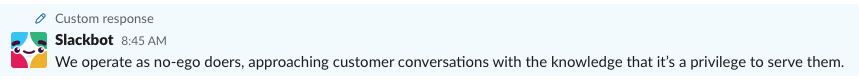 At Buffer, we’ve used the customized automatic responses to help share our values with the team regularly. So whenever anyone says the word “values” Slackbot pops up and shares one of our values with us. It’s sometimes amazing how pertinent the value that was shared is to the conversation!
