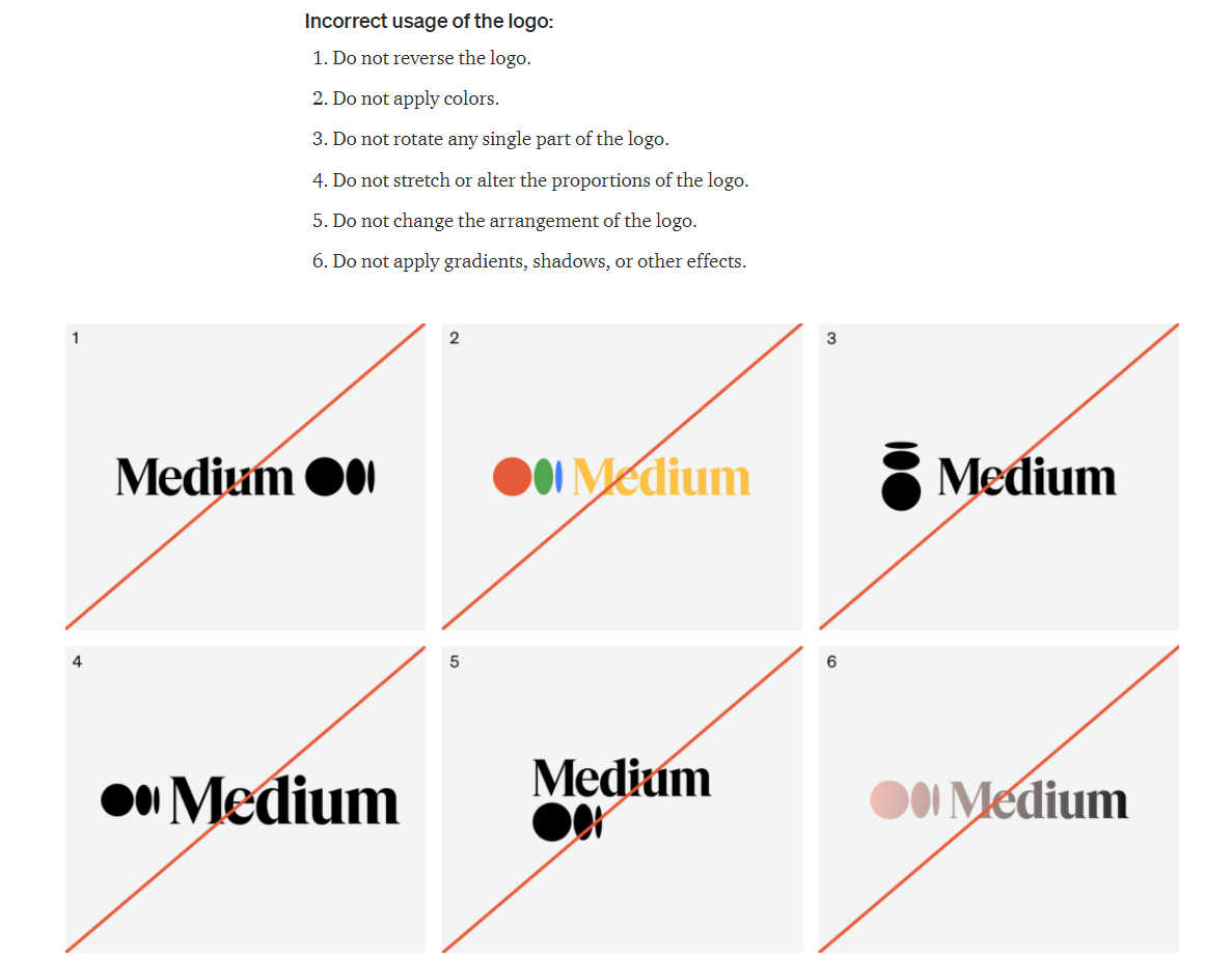 If you want to make your guidelines extra specific, consider adding examples of what not to do, like Medium does with its logo guidelines: