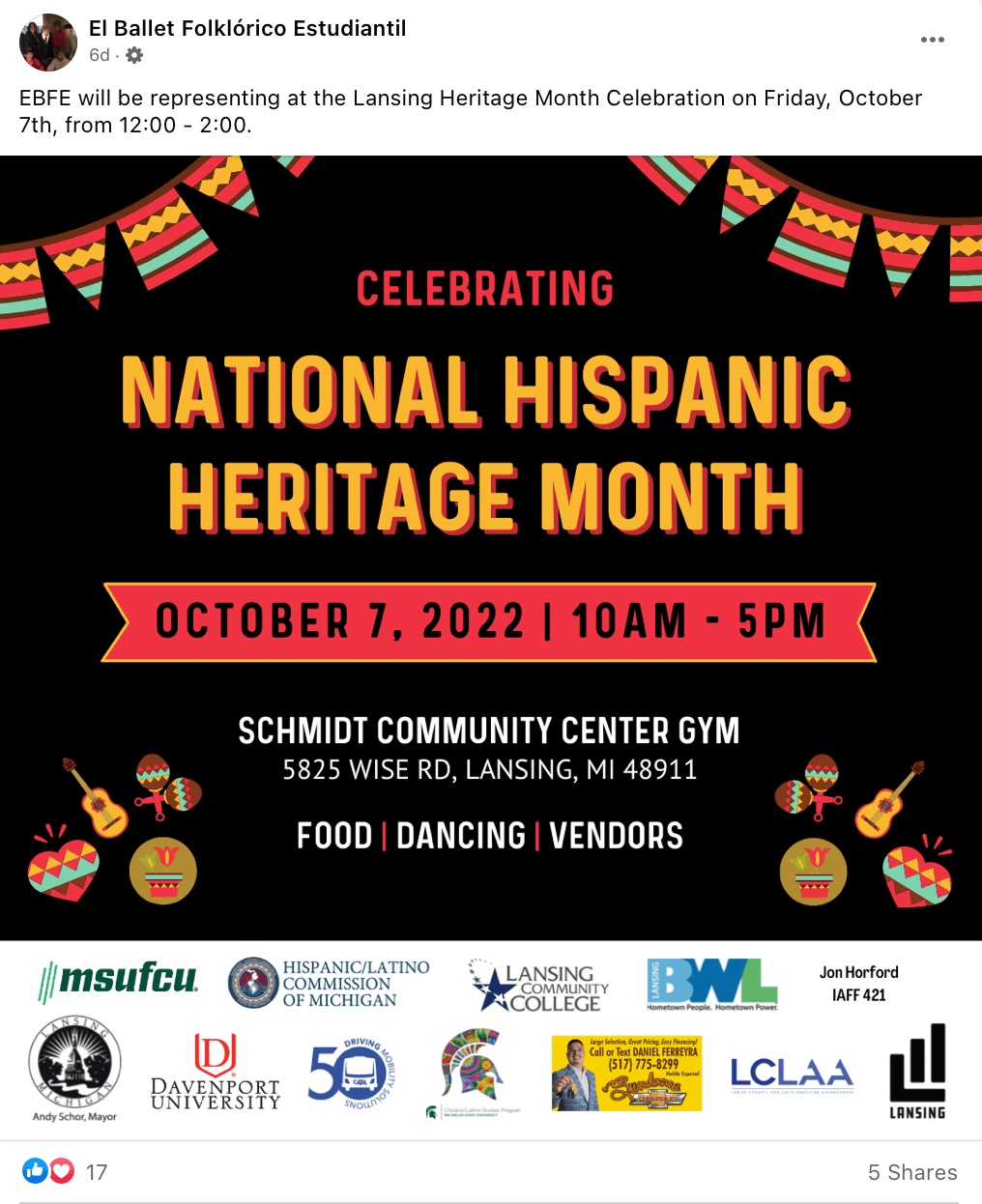 El Ballet Folklórico Estudiantil, translated to The Student Folkloric Ballet, is a nonprofit organization in Michigan that preserves Mexican culture and educates its students on Mexican folkloric dance and music. The Ballet then performs these very dances throughout Michigan, bringing more cultural awareness to the community. They also provide private and group lessons for students wanting to learn instruments.
