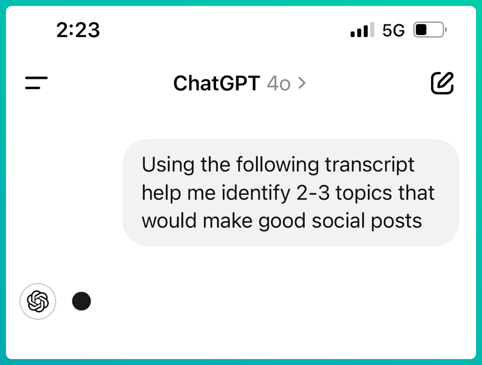 AI is also a good option at this stage as well. Once you have your transcript, you can feed it into ChatGPT or Claude and ask for help identifying the key topics you covered or turning specific sections into social posts. I love doing this because it helps me see patterns in my thinking that I might have missed.