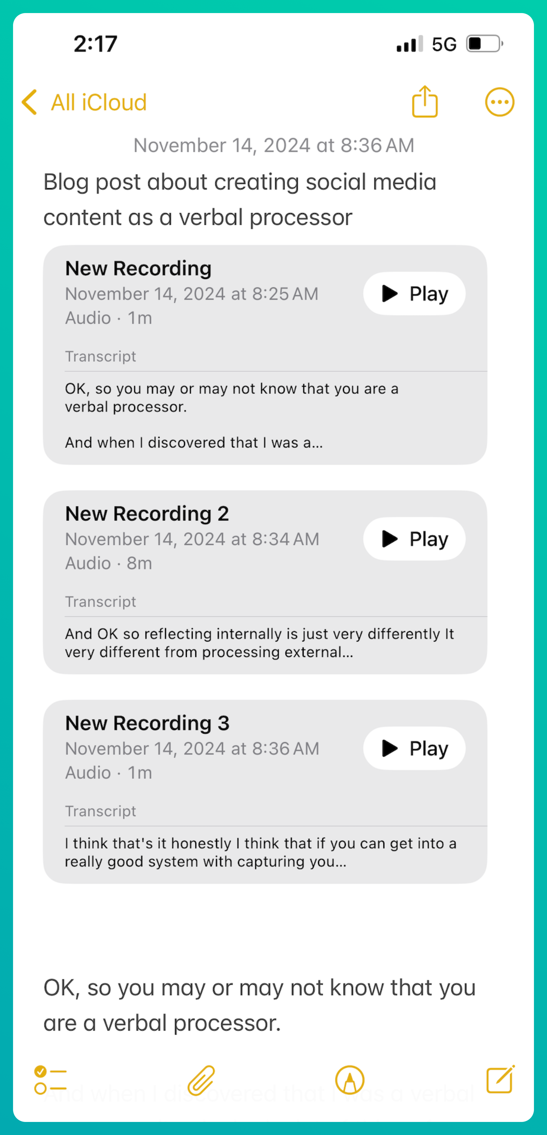 Being a verbal processor isn't a limitation when it comes to creating content, it's actually a superpower if you set things up right. The key is creating a system that works with your natural way of thinking instead of against it. Whether you're recording casual thoughts during a walk, capturing insights from meetings, or interviewing yourself, there are so many ways to turn your verbal processing into valuable content.