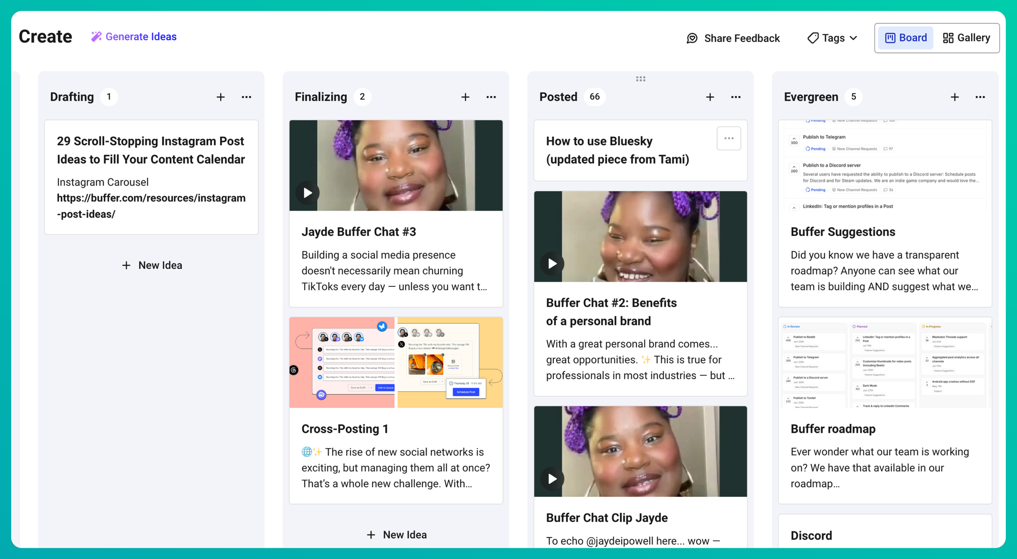 I use Buffer's Create space to store all these ideas and posts. It's become my content home base where I can work through editing and scheduling everything. The key is having a system where these verbal ideas don't just get transcribed and forgotten, they need a place to live where you'll truly turn them into social media posts.