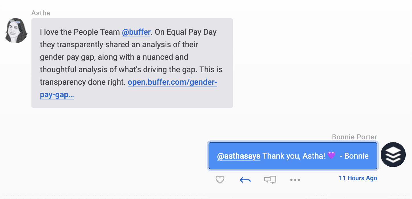 Many marketing messages (“Love using @buffer!” or “This blog post from @buffer is so great”) tend to be less urgent in nature. So rather than setting a lofty goal for response time, we prioritize a delightful experience by ensuring that everyone gets a response who needs one.
