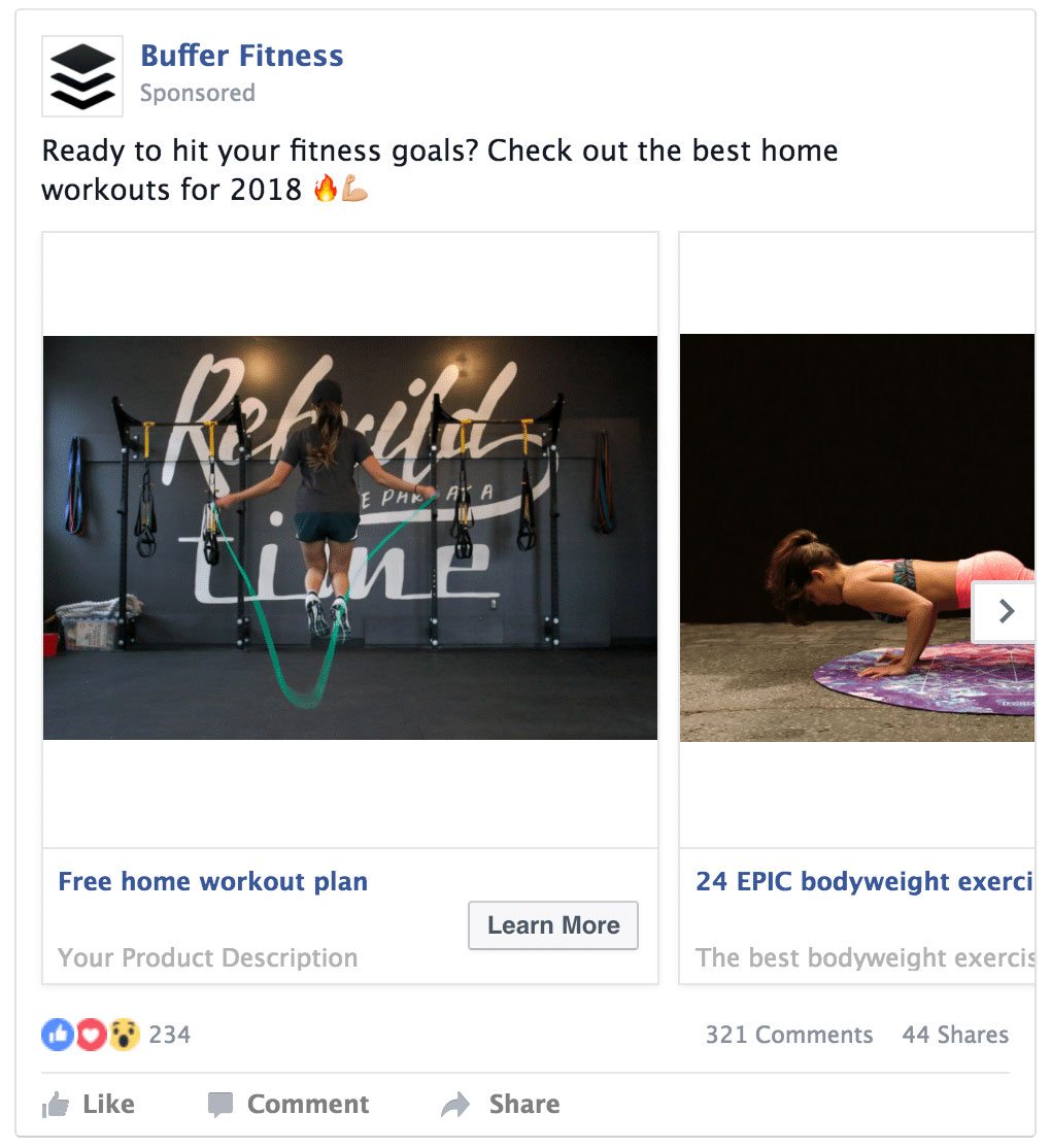 - Step 2: Next, you could create a Facebook carousel ad looking to drive clicks to your website and increase brand awareness amongst people who watched 10 percent of the fitness video you created for step 1:
