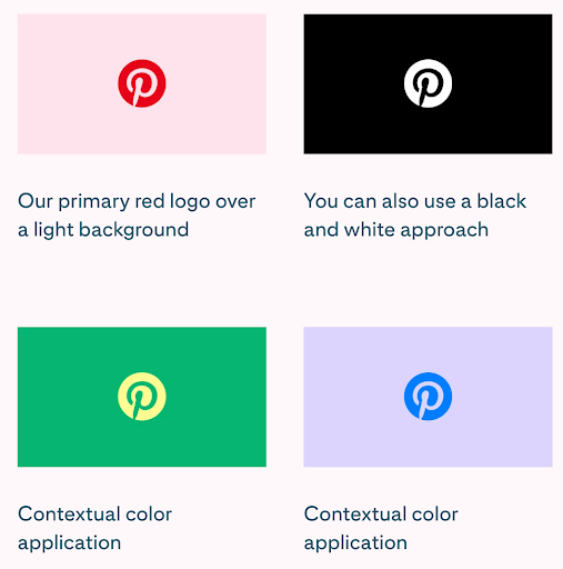 While the main logo is red, Pinterest provides a number of other colors within their brand assets to complement any background color.