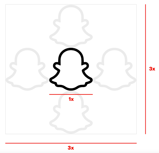 When using Snapchat’s branding it’s important that no other logos or elements infringe the space around it. Clear space around the logomark should always be equivalent to the full width of the logo. The minimum size the logomark may be used for print applications is .4” (10mm) wide and for digital applications, the minimum size is 45 pixels wide.