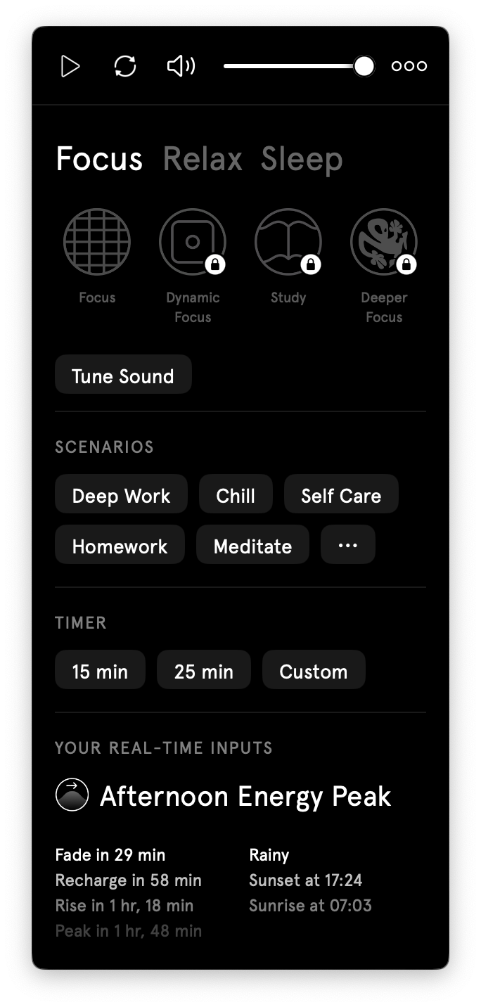 Endel is a really neat tool for creating soundscapes and focus music. This is particularly good for those who lose focus, procrastinate often, and need background noise that isn't distracting.