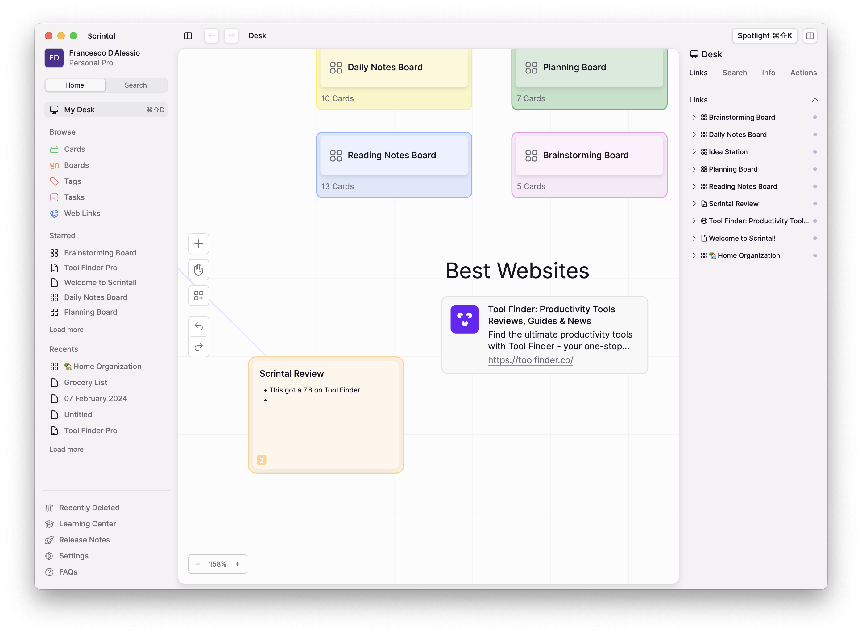 You could consider using Scrintal if you want a visual note-taking space, and that is how your mind works best. Scrintal is aimed at those who want to brainstorm ideas, collaborate, and create a decision-making space for content creation.