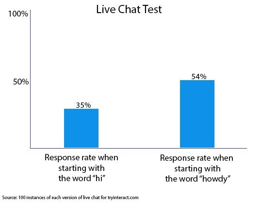 That was years ago, but I never forgot it, so when I started doing Live Chat for interact, I ran the test again – only this time it was much more precise. Doing proactive live chat (where I initiated the conversation with visitors), I started 100 conversations with the word “hi” and 100 conversations with the word “howdy.” While only 35 of the “hi” people responded, a full 54 of the “howdy” folks responded and started conversations, some of which led to sales.