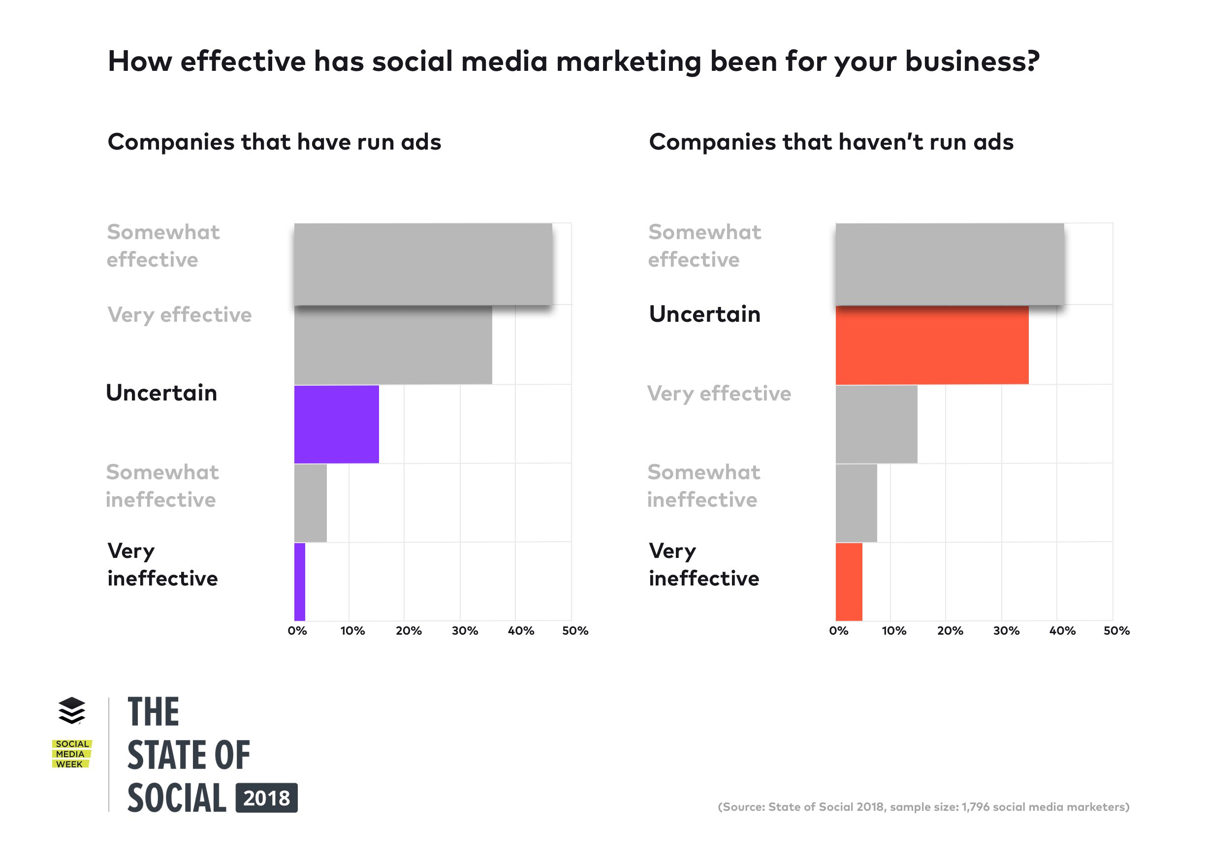 Whereas businesses that have not invested in ads are more than twice as likely to report that the effectiveness of social media marketing for their business is “uncertain” or “very ineffective”.