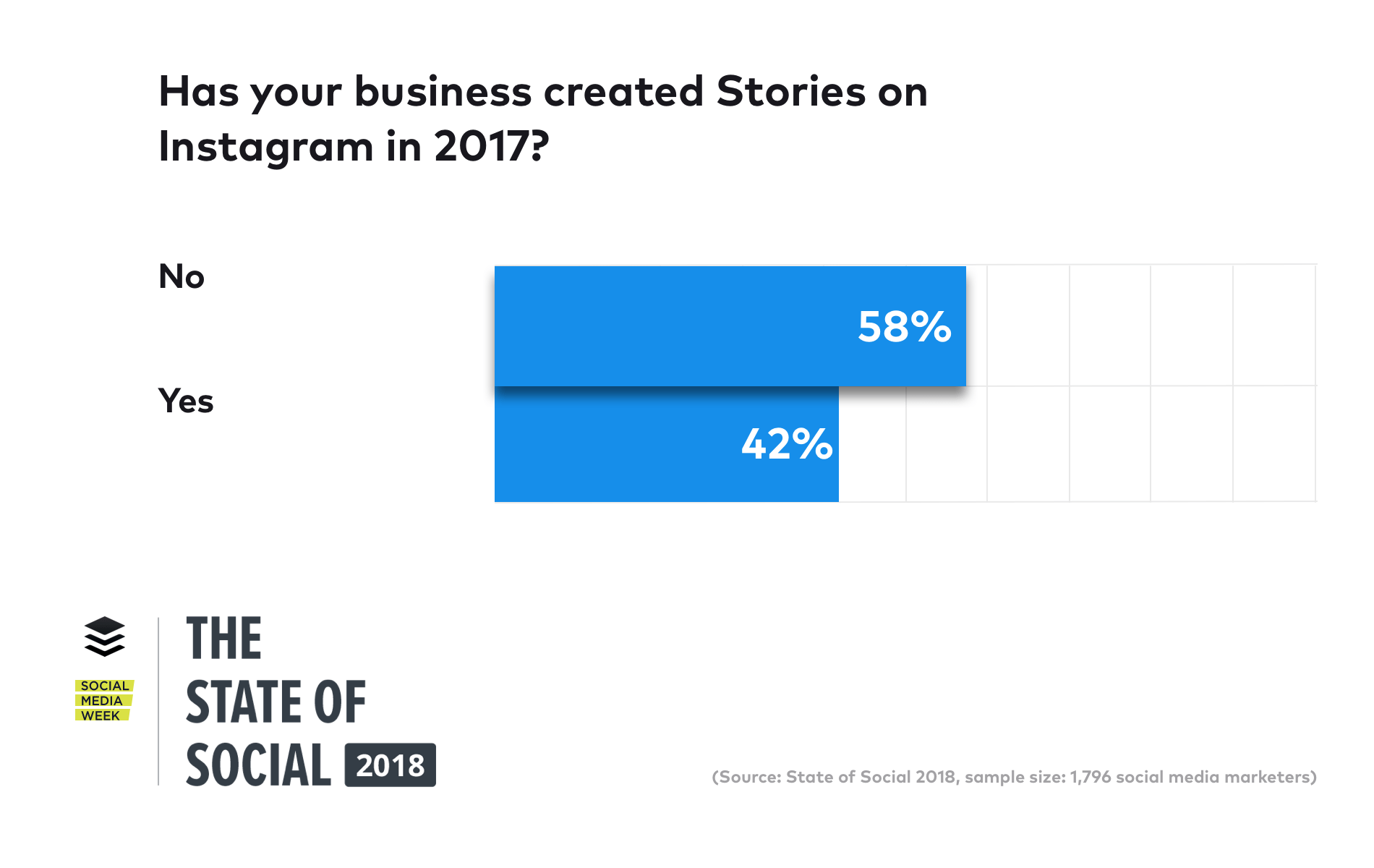 Last year, only 29 percent of State of Social respondents had created stories on Instagram or Snapchat. This year 42 percent have created stories on Instagram (just 11 percent had created stories on Snapchat):