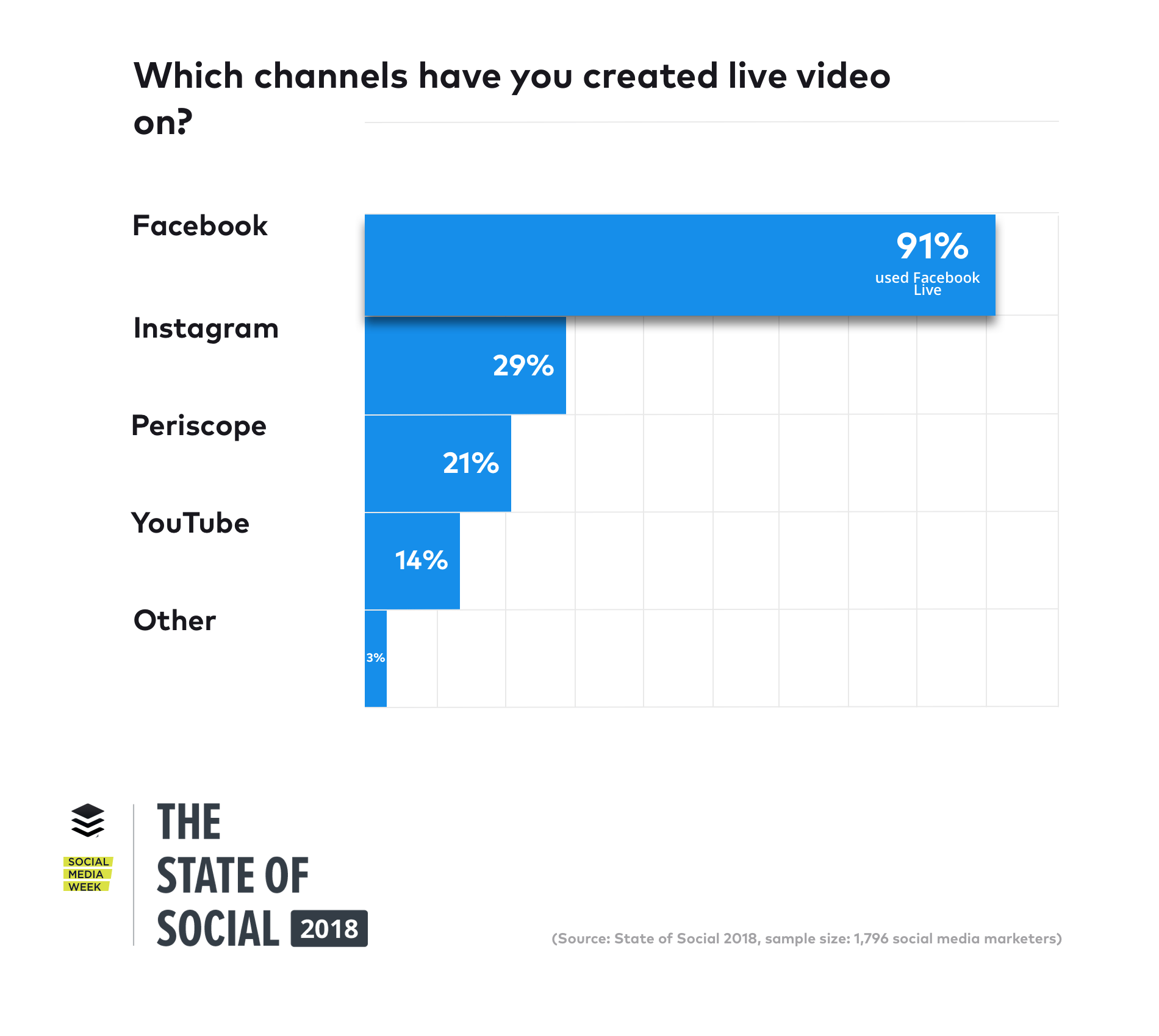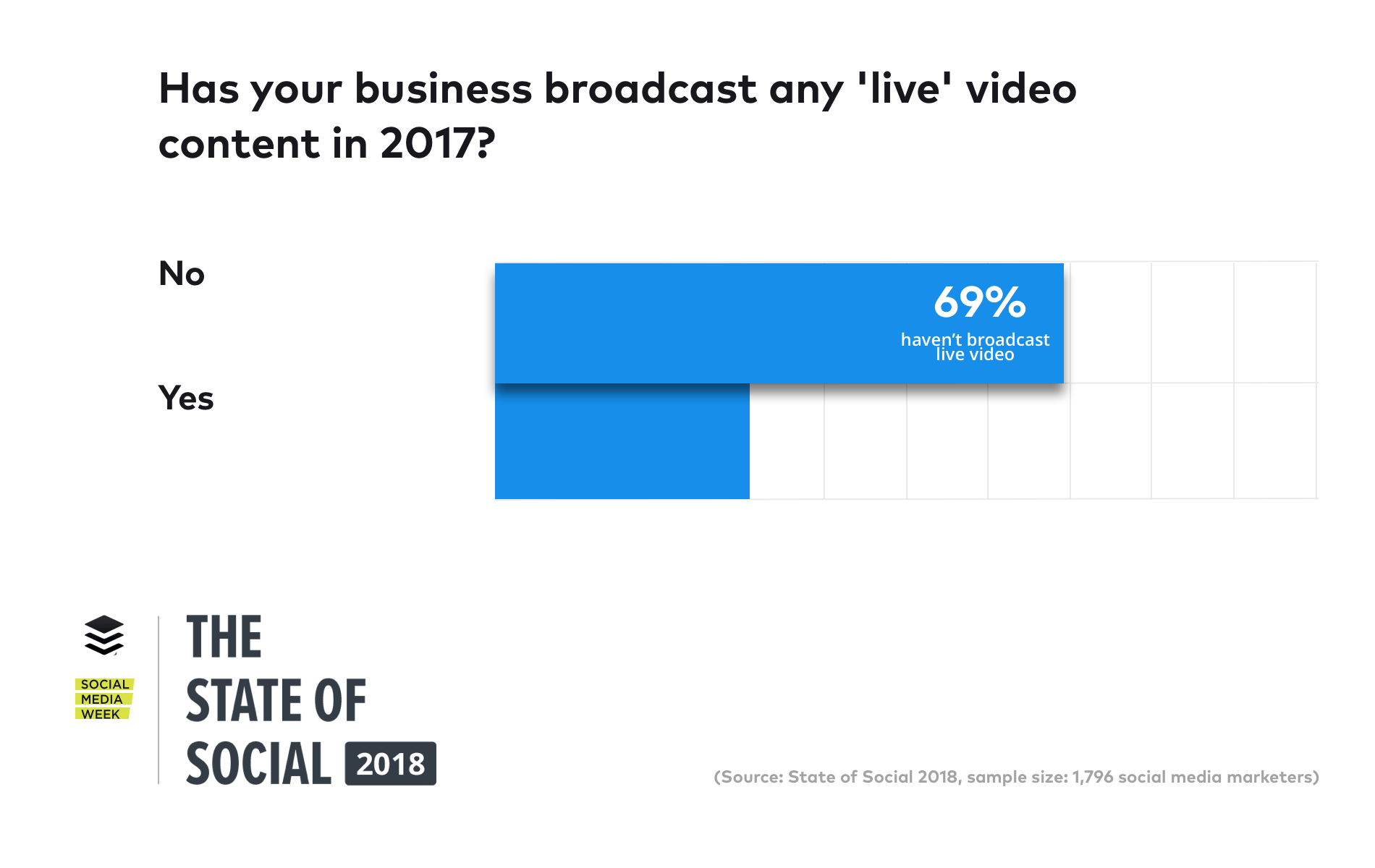 In our last State of Social report, 26 percent of marketers said they had created live video content. In 2017, 31 percent of marketers said they had broadcast live content—just a 5 percent increase: