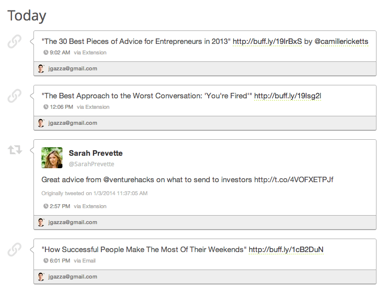 — Joel Gascoigne (@joelgascoigne) November 25, 2013Now when Joel adds new Tweets to his Buffer queue, he thinks about the type of each one, and how we wants to use those types to add variety to his Twitter account. Joel’s found a good balance between these by working with a sharing ratio.
