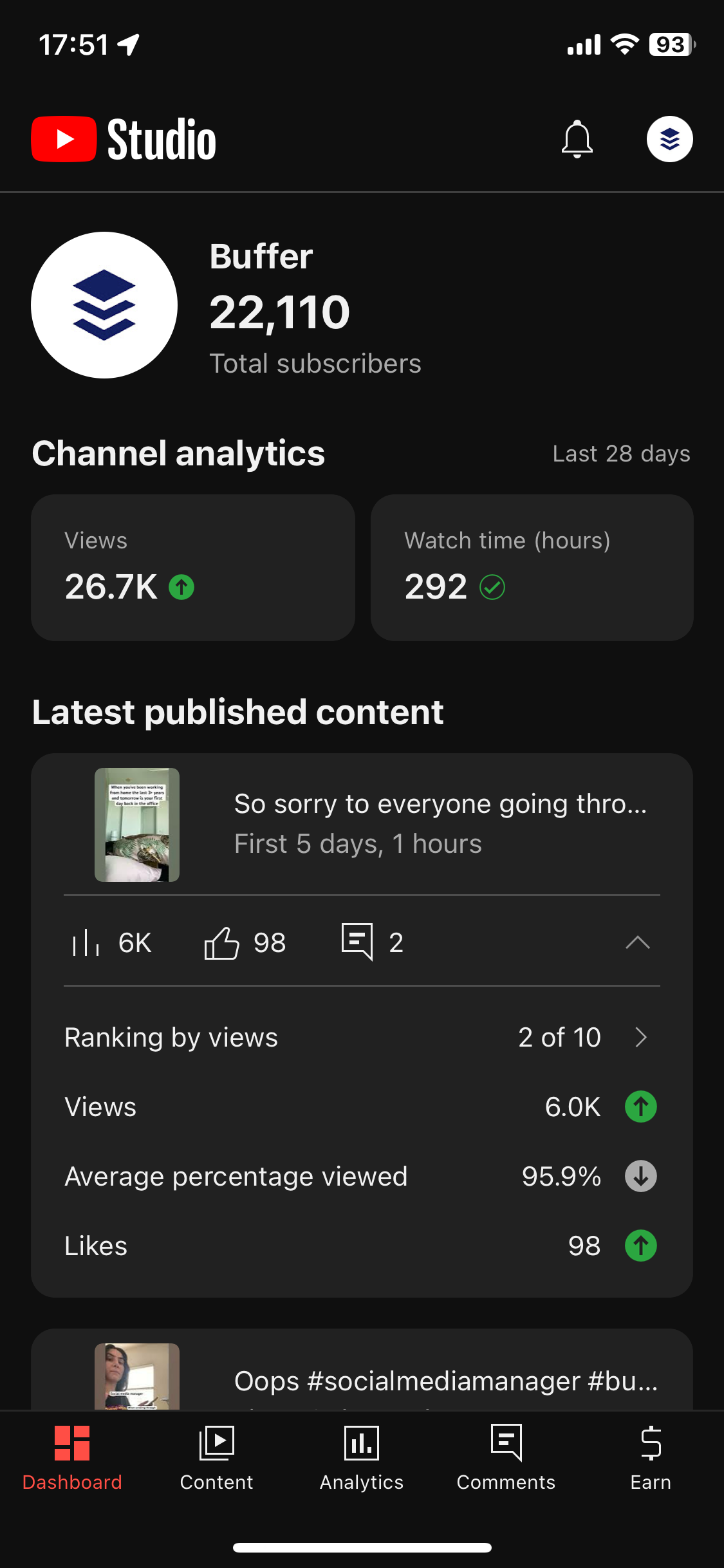 You can also see an overview of the top content you’ve published in a selected time period and a summary of the total views and average view duration.