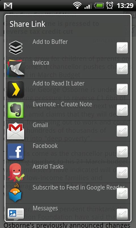 On my Android phone, almost anything can be clipped to Read It Later using the Share menu. I use Andmade Share, a tiny utility that runs in the background and replaces the standard share menu. It enables you to reorder the menu items to bring the most frequently used to the top, and allows you to send content to several apps at the same time by checking multiple options before tapping one of them to launch the share operation.