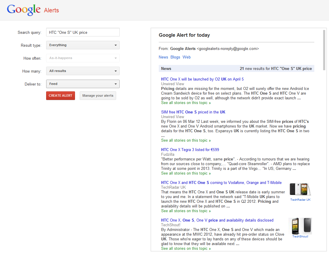 Of course you can grab RSS feeds for most blogs and websites. Some even allow you to build customised feeds which include only content related to the topics that interest you. But it’s less well known that you can turn a Google search into an RSS feed using Google Alerts. Enter the search string (a preview of the results appears on the right), adjust Result type and How many, select Deliver to: Feed, and hit the Create Alert button.