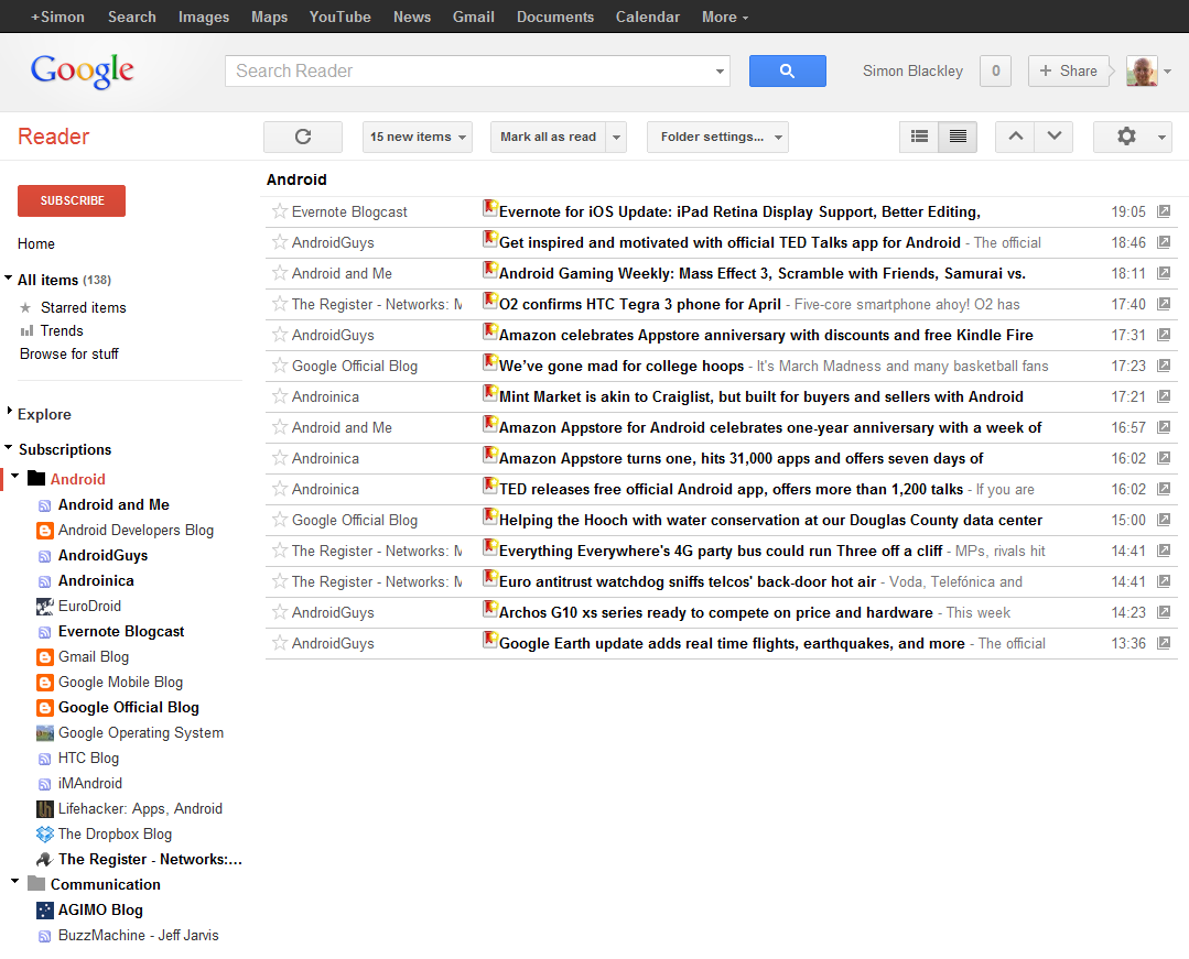 I’m a big fan of RSS. RSS does a lot of curating while I sleep. A well-organised RSS reader is like a butler who irons the paper and brings it to you in the bath.